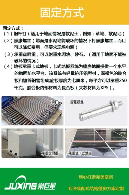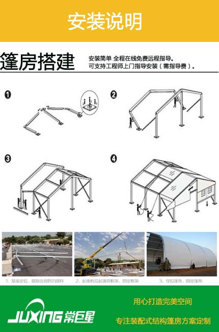 常巨星裝配式篷房公司是一家篷房研發(fā)、生產(chǎn)、銷售、租賃于一體的綜合性篷房公司。巨星公司秉著誠信經(jīng)營、客戶至上的經(jīng)驗理念服務客戶。本公司產(chǎn)品外觀簡潔大方,內(nèi)無支柱,百分百利用空間。可選配設施,可加照明,排水,防撞,地臺,空調(diào),發(fā)光燈箱,等系統(tǒng)?,F(xiàn)有篷房主體框架為中空鋁合金結構,連接部位為采用國家焊接鋼結構,可調(diào)節(jié)式基座可彌補場地的不平,篷房采用PVC篷布,該篷布具有不拉伸的良好性能,不透光,采用高頻焊接技術,篷房抗風能力達到80-100公里/小時。具有體積小,儲存方便,拆裝靈活快捷易運輸?shù)忍攸c,單位組合式結構,可根據(jù)場地的大小自由增加,對搭建場地無特殊要求,一般場地如草地、大理石地、瀝青地面、水泥地均可。篷房內(nèi)無支柱,場地空間得到利用